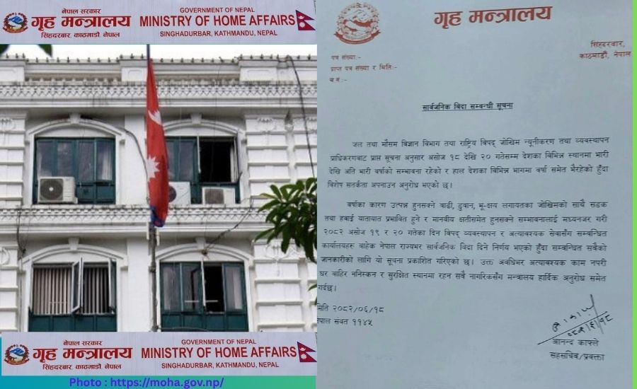 Kathmandu, October 4, 2025 – The Government of Nepal has announced a public holiday on Ashoj 19 and 20 (October 5–6, 2025) for all government and non-government offices, excluding essential services, due to ongoing heavy rainfall and increased risk of floods and landslides.